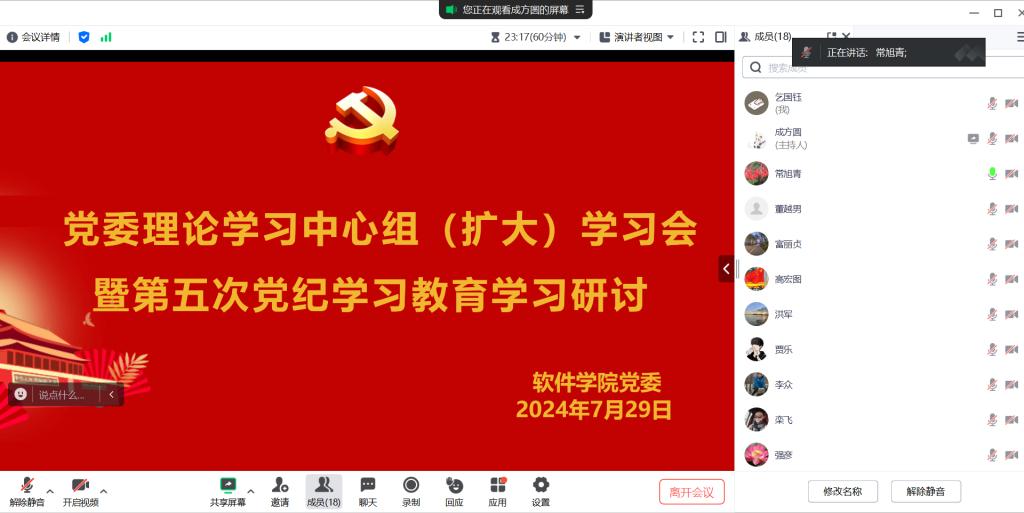 根据校党委工作安排,2024年7月29日下午,软件学院党委召开理论学习中心组(扩大)学习会暨党纪学习教育第五次学习研讨。党委委员、各科室科长、各党支部书记、纪检干部参加会议,会议由党委书记常旭青同志主持。