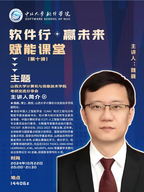 在14406z教室举办了“软件行·赢未来”赋能课堂第十讲——山西大学计算机与信息技术学院考研交流分享会。本次课堂特别邀请到山西大学计算机与信息技术学院副院长魏巍担任主讲。学院党委副书记高宏图主持讲座,就业辅导员乞国钰参加活动,21级、22级学生参与了讲座。