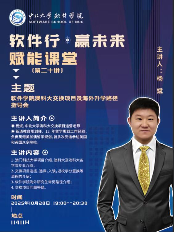 依托“软件行·赢未来”赋能课堂品牌,于10月28日晚在11411H教室成功举办了澳门科技大学交换项目宣讲暨海外升学路径指导会,吸引了我院百余名有国际发展意向的学生踊跃参与。