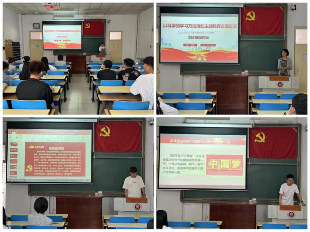 会议首先开展了支部书记讲党课活动,魏跃亲老师针对全党正在深入开展的学习贯彻习近平新时代中国特色社会主义思想主题教育,为大家带来了主题为《以科学的学习方法推动主题教育走深走实》的报告。她指出,重视学习、善于学习是中国共产党的优良传统,支部全体党员要在纵横比较中、深学笃信中、精思细悟中、知行合一中全面系统把握习近平新时代中国特色社会主义思想的历史地位、科学体系和方法精髓。大会第二项由谭亚军和赵印两位同志领学习近平新时代中国特色社会主义思想精神并分享他们的学习心得,谭亚军分享主题《为推动经济高质量发展和实施科教兴国战略,强化现代化建设人才支撑》,赵印分享主题为《坚持全面深化改革;推进社会主义民主政治建设,发展社会主义政治文明》。