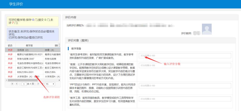 进入评价页面后,左边可以看到需要评价的课程和每门课程的评价状态,在评教过程选择具体课程,在右边的评价指标中进行评价,每评完一门课程后点击最下面的保存按钮进行保存,然后选择下一门课进行评价,全部课程评价完成后点击下面的提交按钮进行提交,提交后不能修改。(注:打分采用的是“百分制”)
