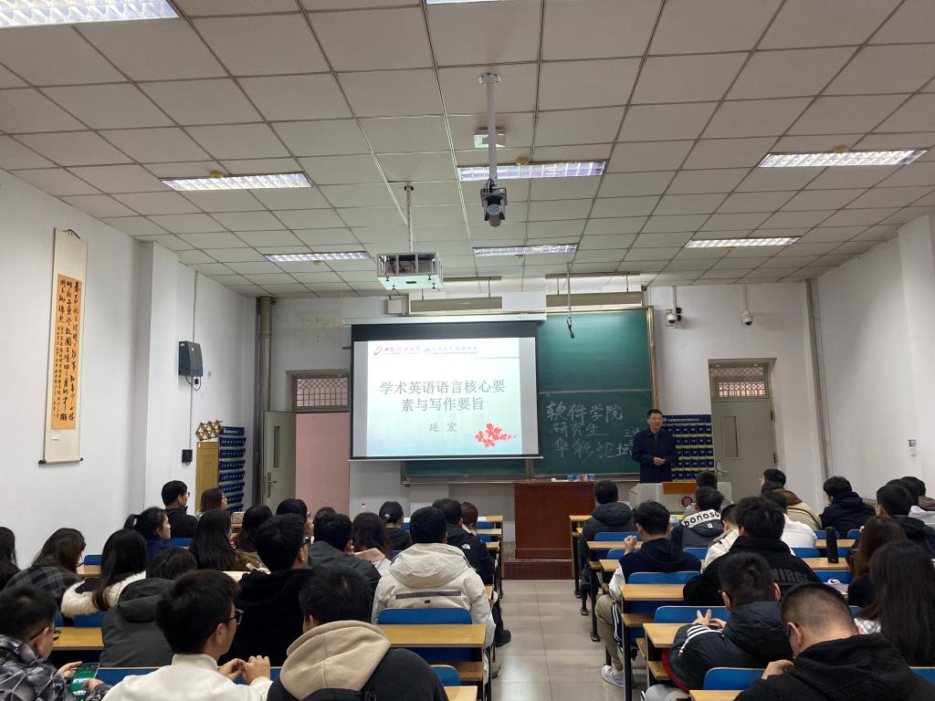 成功举办主题为“学术英语语言核心要素与写作要旨”华彩讲坛学术活动。此次讲坛有幸邀请到西安理工大学延宏教授,延教授是全国著名科技英语专家、西安理工大学学报编辑部英文译审,同时担任丝路翻译产业联盟总译审以及国家社科基金项目成果鉴定专家,其研究方向聚焦于学术英语翻译与写作。学院杜建海老师主持了活动。